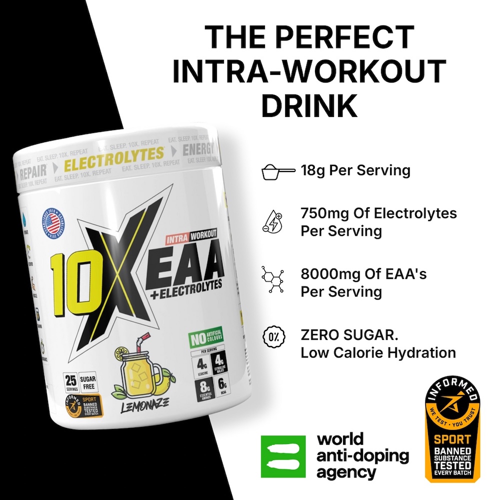10x ATHLETIC EAA is a great tasting, vegan sourced essential amino acids recovery & performance drink to help you push through your workout and recover faster.